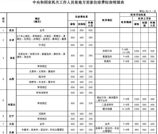 财政部印发关于《中央和国家机关工作人员赴地方差旅住宿费标准明细表》的通知规定,部级官员出差北京,住宿费标准每天限额为1100元,司局级官员每天限额650元,其他人员每天限额500元。部级官员赴天津、河北、山西、内蒙、辽宁、大连、吉林等地,住宿费标准每天限额多为800元。