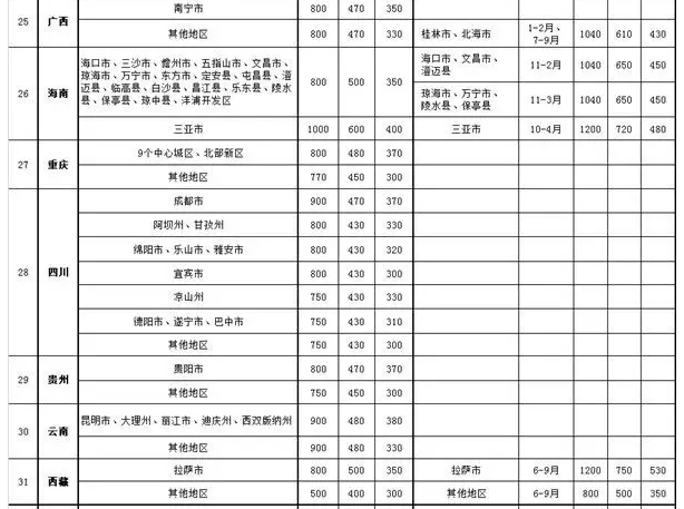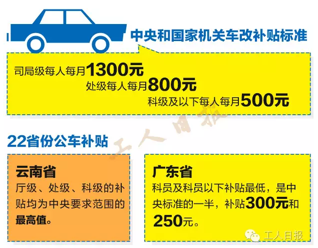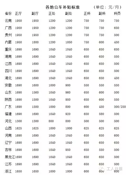 从目前公布的22地公车补贴来看,云南、广西、贵州均是补贴“顶格”,是司局级1300元标准的150%。值得一提的是云南省,厅级、处级、科级的补贴均为中央要求范围的最高值。