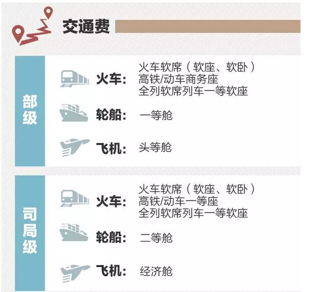 如果坐飞机出行,省部级干部才能坐头等舱,司局级和其他干部只能坐经济舱。乘坐火车的情况稍微复杂一些,县处级及以下干部只能坐硬座、硬卧,高铁二等座等。需要提醒的是,如果“超标”乘坐了交通工具,比如县级干部坐了飞机头等舱,那么差价需要自己补上。