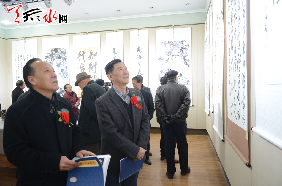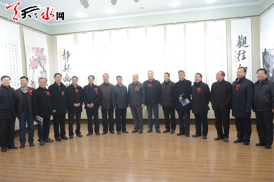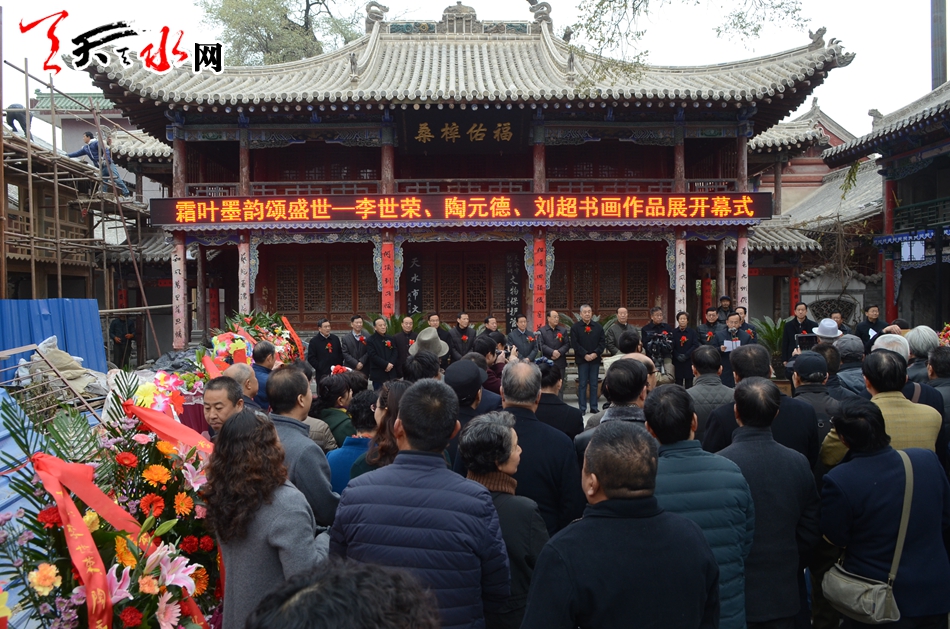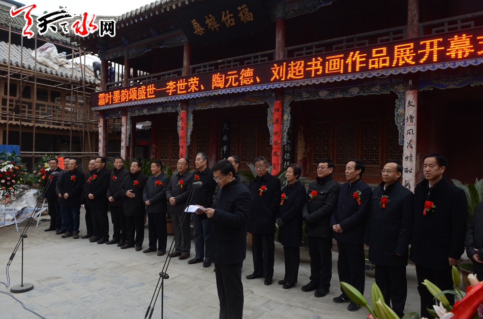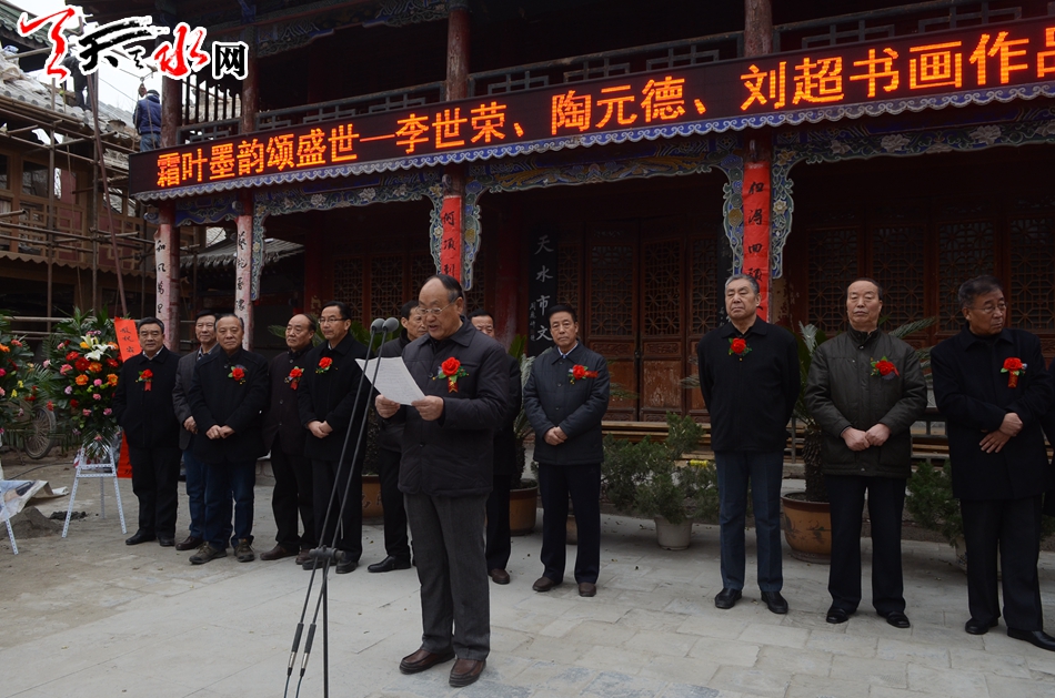 天天天水网讯【记者何郁】11月25日,霜叶墨韵颂盛世——李世荣陶元德刘超书画作品展在天水市文化馆隆重开幕。天水市政协副主席王振宇、刘永年、苏定武,老干部乔正风、王志荣等出席开幕式。
