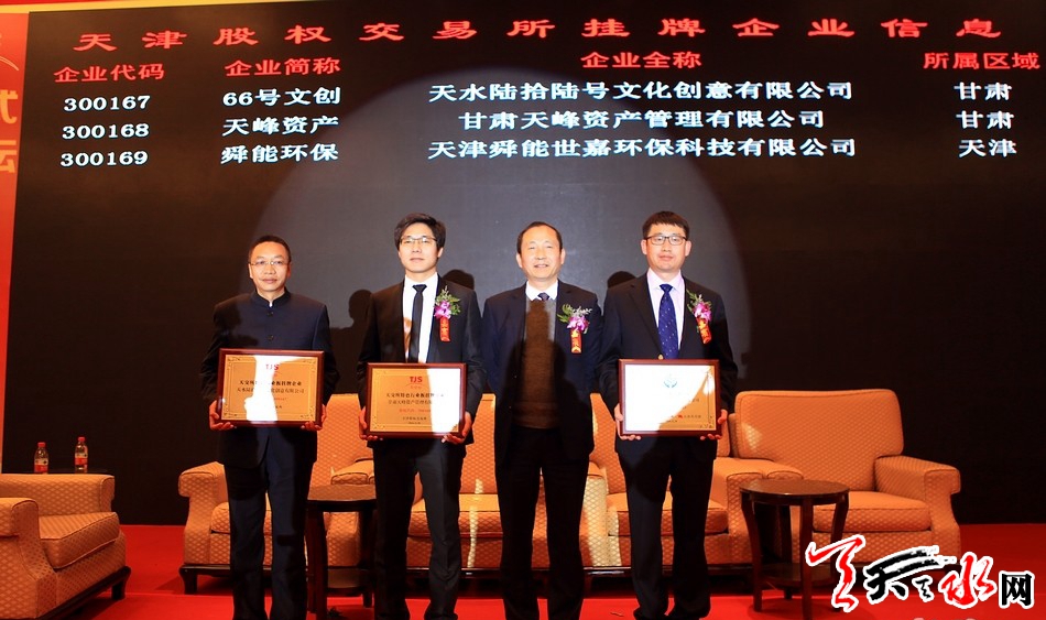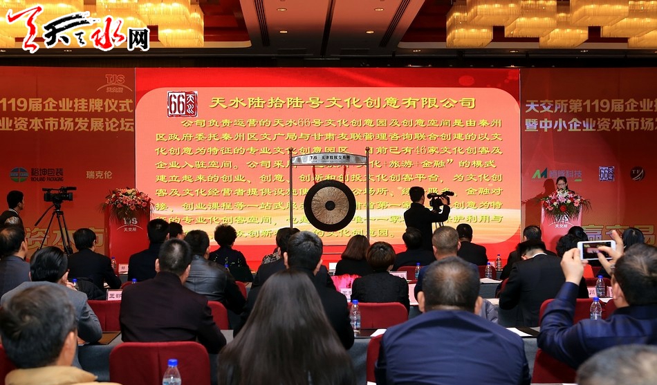 天天天水网天津电 11月28日,天水66号文化创意有限公司在天津股权交易所挂牌,成为全省进入股权资本市场的第一家文化创意企业,迈开了我省文化双创企业进入资本市场第一步。同日,天水市另一家企业——甘肃天峰资产管理有限公司也在天津股权交易所挂牌。