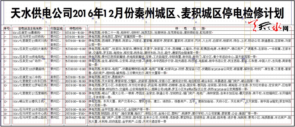 天水供电公司2016年12月份秦州城区、麦积城区停电检修计划