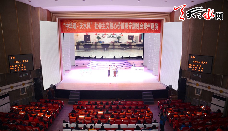 天天天水网讯【见习记者闫波】11月30日晚,“中华魂·天水风”弘扬社会主义核心价值观专题晚会在秦州大剧院上演,一批弘扬社会主义核心价值观的精彩节目赢得了现场观众的热烈掌声,秦州区机关事业单位干部、环卫工人、城管以及在校师生近千人观看演出。天水市委常委、宣传部长蒲军观看演出并慰问演职人员。
