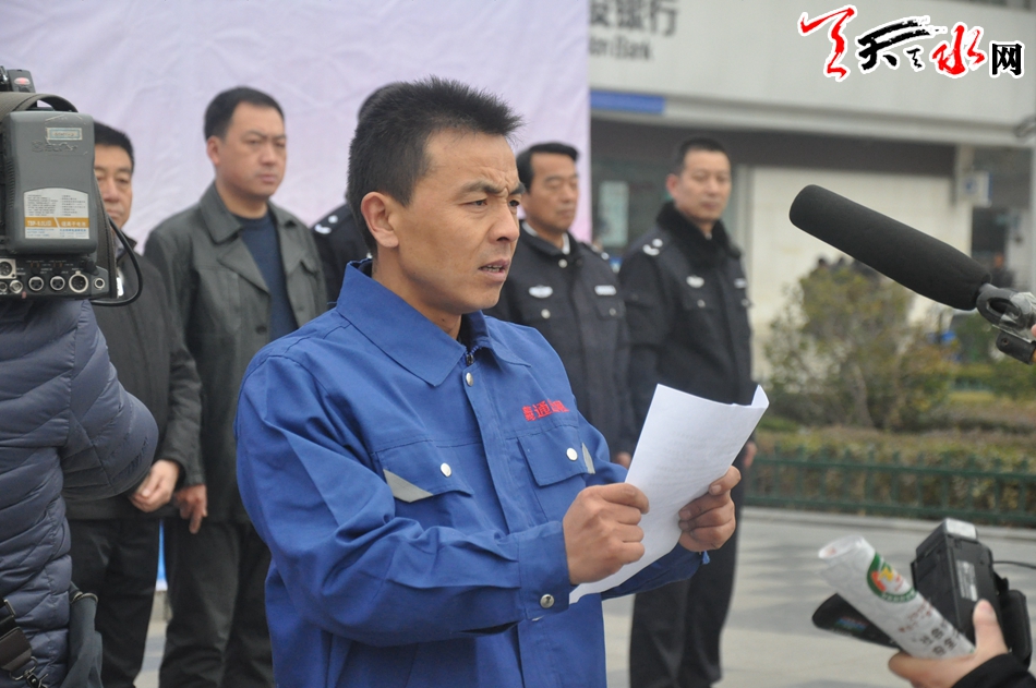 ▲天水市公安局党委委员、交警支队支队长杨金生宣读《安全文明出行倡议书》