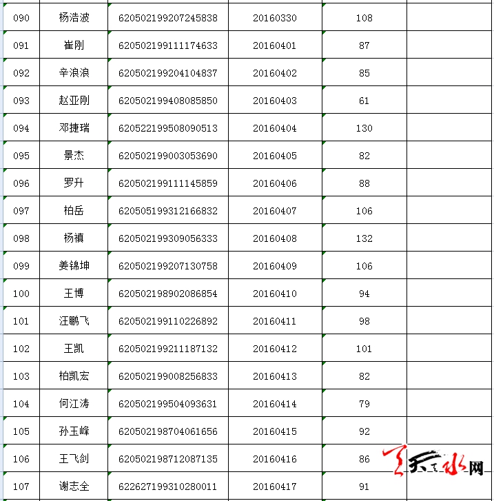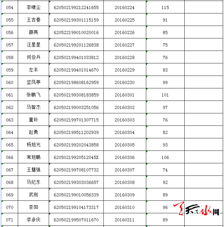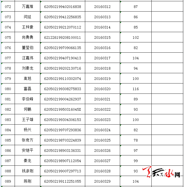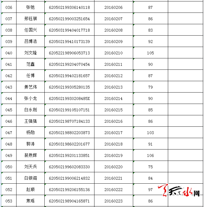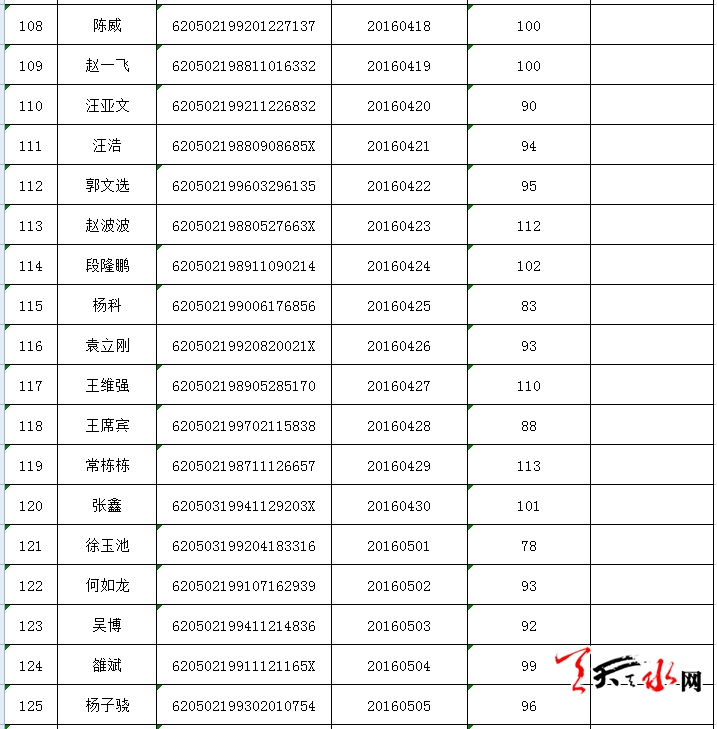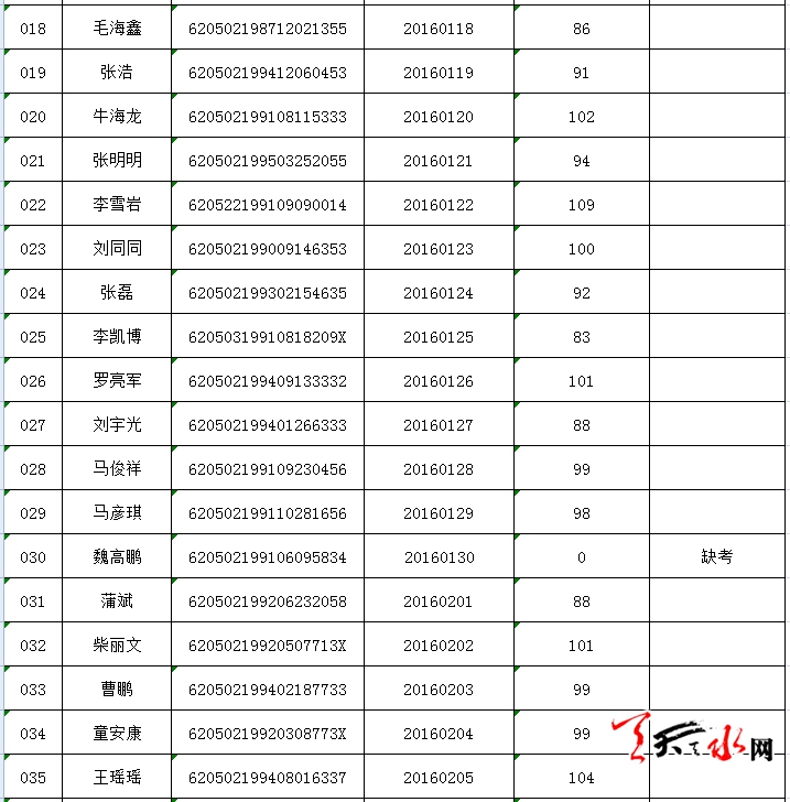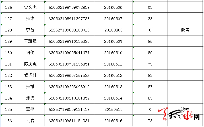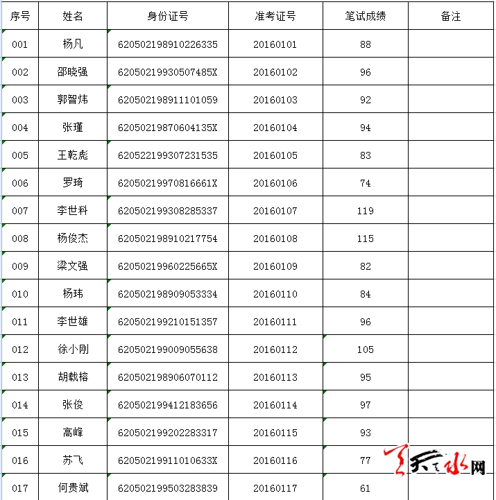 附:2016年天水市秦州区公开招聘交通协警笔试成绩公示单