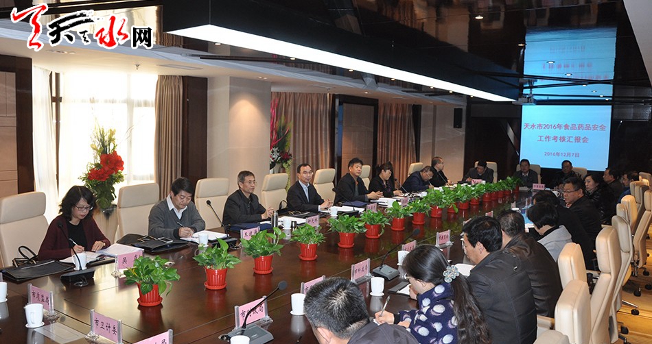12月7日下午,召开了天水市2016年食品药品安全工作考核汇报会。省食安办副主任、省食药监局副局长宋保才和考核组成员,市政府副市长张建杰、市政府副秘书长张有信及市食安委成员单位负责人出席会议。