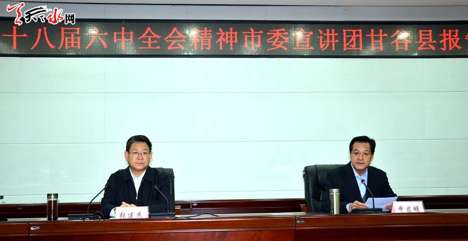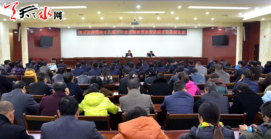 天天天水网讯 据甘谷县政府网消息 12月9日,天水市副市长张建杰到甘谷县宣讲党的十八届六中全会精神。他强调,甘谷县各级党组织和广大党员干部要把深入学习贯彻党的十八届六中全会精神作为当前和今后一个时期的首要政治任务,以高度的政治责任感和使命感,全方位、多层次的抓好全会精神的学习和贯彻落实。