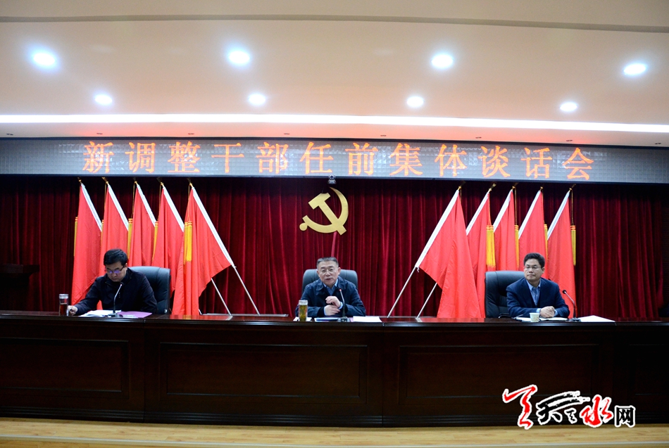 天天天水网讯【记者郝勤学】12月27日,天水市委召开新调整干部任前集体谈话会,市委书记王锐出席会议并讲话强调,各级领导干部要坚持不懈加强学习,尽心竭力担当负责,高度重视搞好班子团结,落实管党治党政治责任,以创新进取的工作态度和奋发有为的工作作风,全力做好各项工作,努力推动全市经济社会发展迈上新台阶。