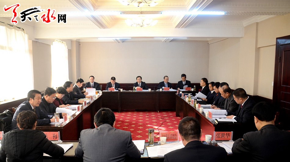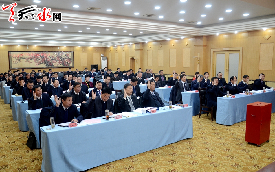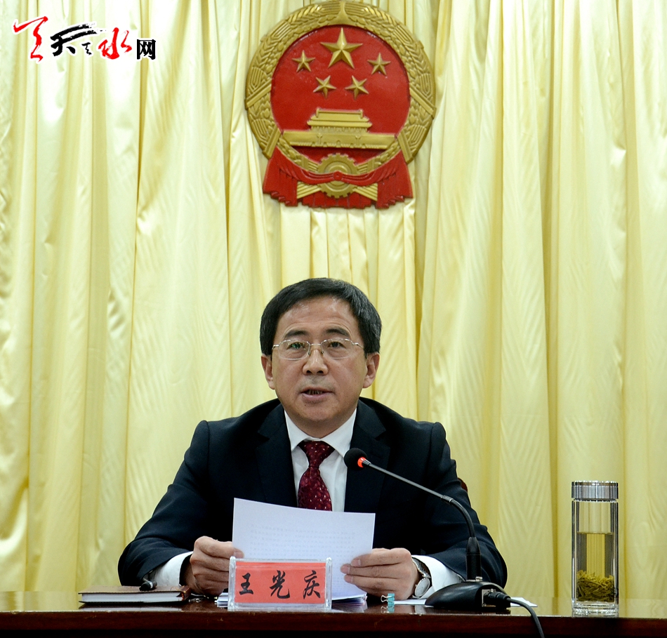 ▲天水市人大常委会党组书记、主任王光庆主持第一次全体会议并讲话