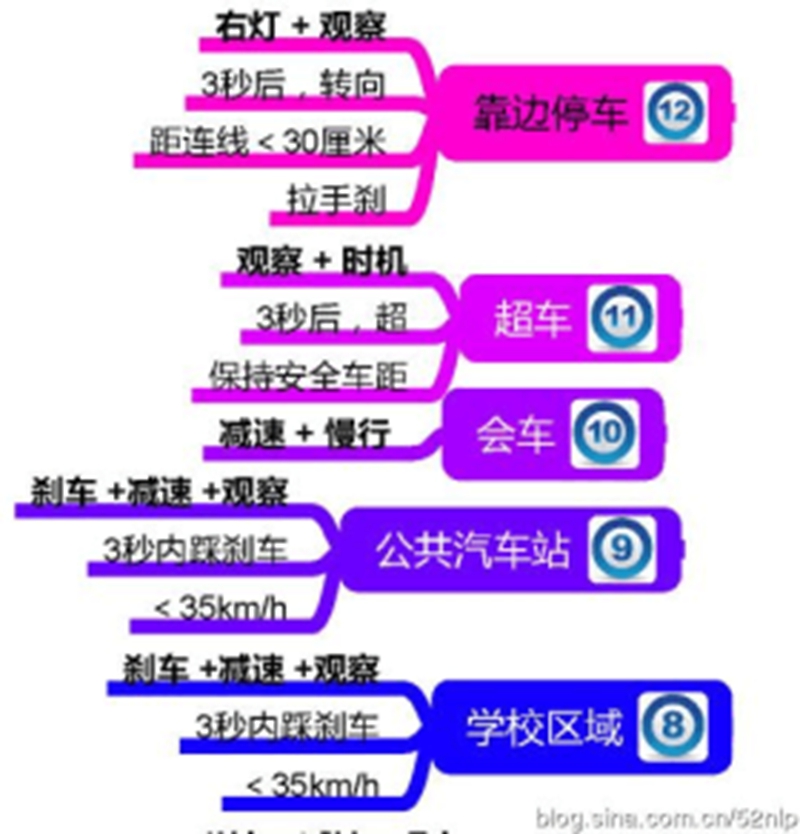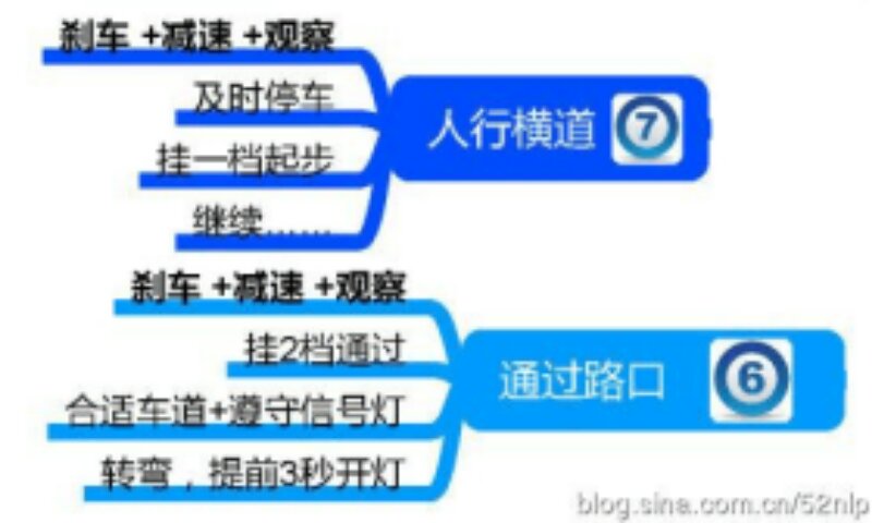 8、通过人行横道:减速慢行,松油门,时速不超过25公里(遇到行人时必须停车等待:停车-拉手刹-挂空挡-左转向-挂1挡松手刹起步正常行驶);