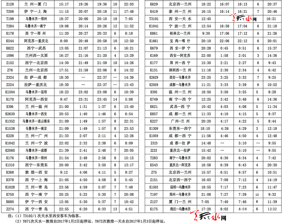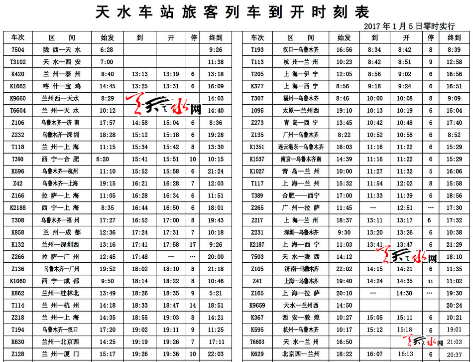 天天天水网讯【记者甄娜】从2017年1月5日起,铁路实行新的列车运行图,调图后,途经天水火车站的部分列车又有了新调整。