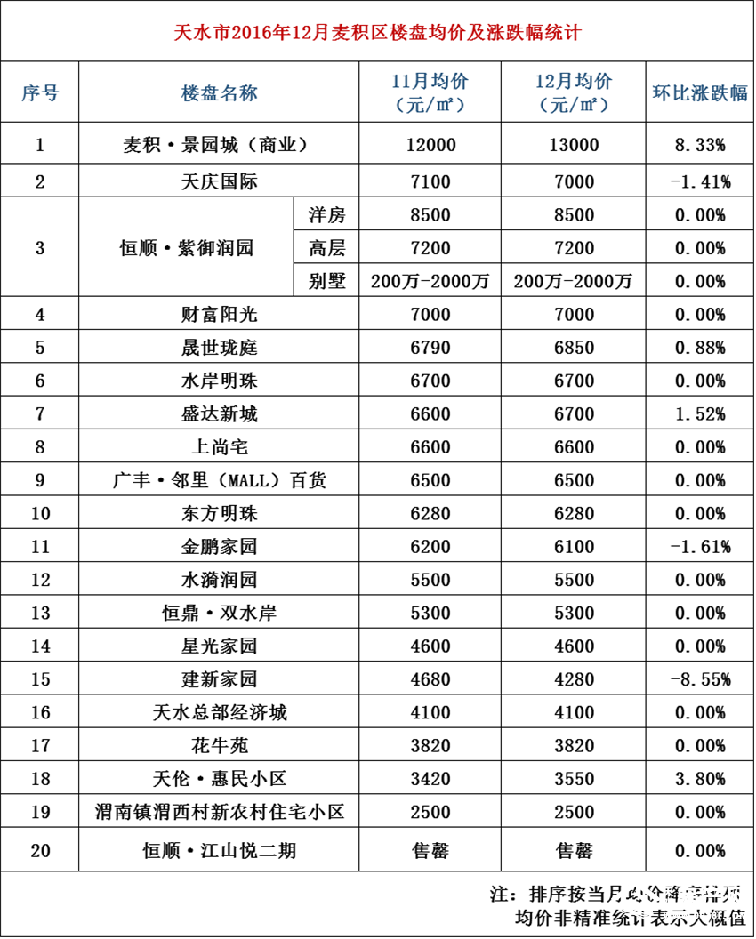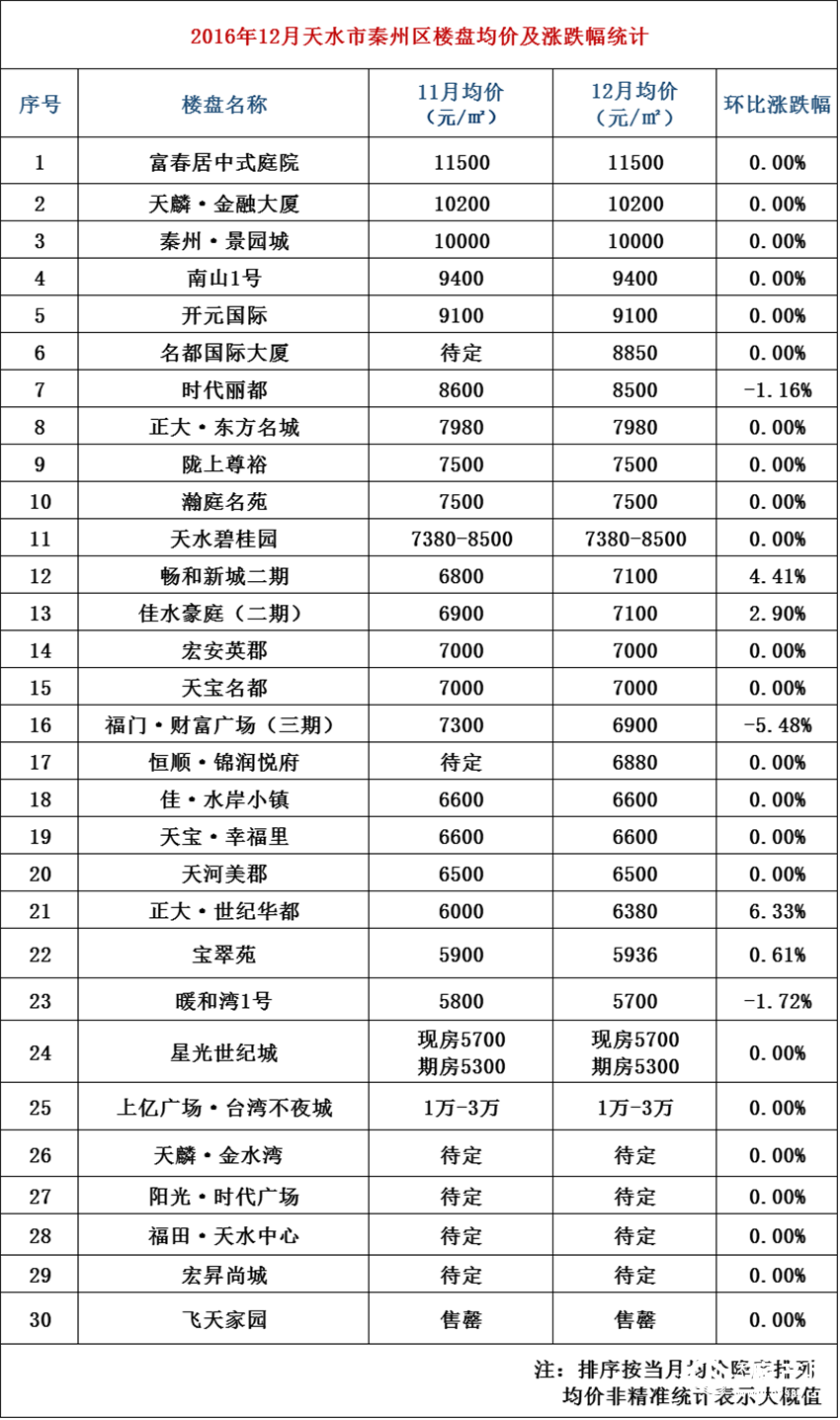 本月秦州区统计商品房项目共30个,环比上月新增名都国际大厦公寓项目。其中,在售项目25个、待售项目4个、售罄项目1个,现房项目5个。各楼盘价格变动情况,本月均价上涨楼盘4个、最高上涨4.41%,均价下调楼盘3个、最高下降5.48%。以下为秦州区12月份各楼盘及价格变动详情统计。