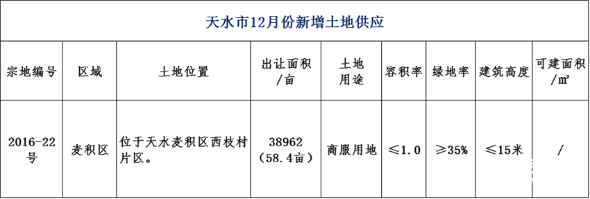 12月份,天水市区新增土地供给一宗,位于麦积区西枝村片区,土地出让面积58亩,为商业服务用地,规划最大计容建筑面积约4万㎡。