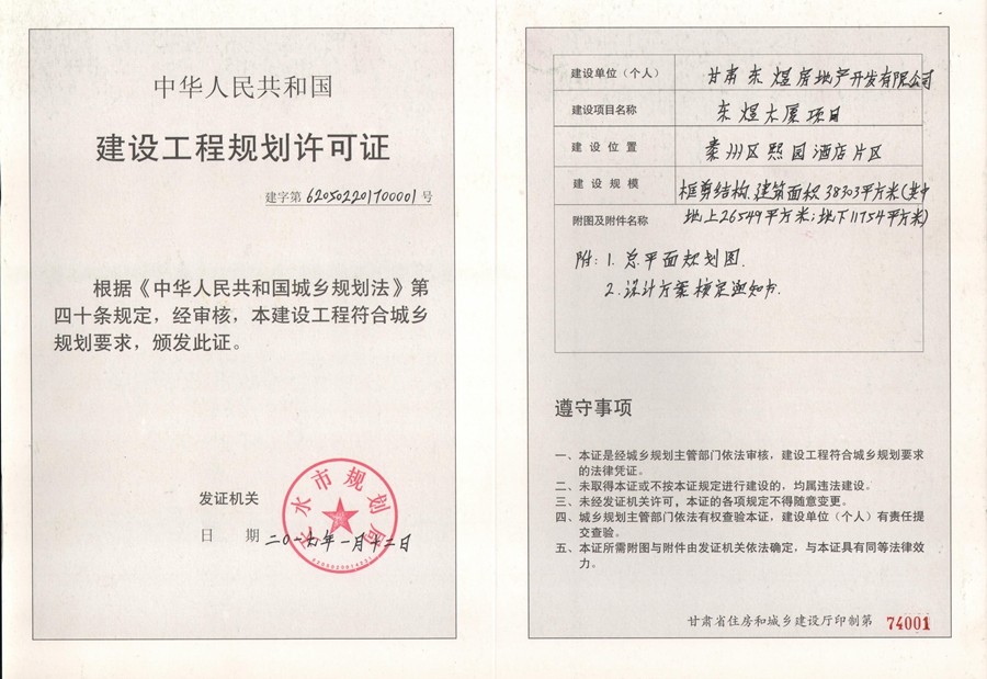 二期项目(4#-6#楼)许可证编号为建字第6205022016000102号,建设地址为“秦州区石马坪片区”,建设规模为“框剪结构,建筑面积59659.9平方米(其中地上36345.7平方米,地下23314.2平方米)”,建设单位为甘肃天翔房地产开发有限公司,发证日期为2016年12月29日。五、东煜大厦许可证编号为建字620502201700001号,建设地址为“秦州区熙园酒店片区”,建设规模为“框剪结构,建筑面积38303平方米(其中地上26549平方米,地下11754平方米)”,建设单位为甘肃东煜房地产开发有限公司,发证日期为2017年1月12日。