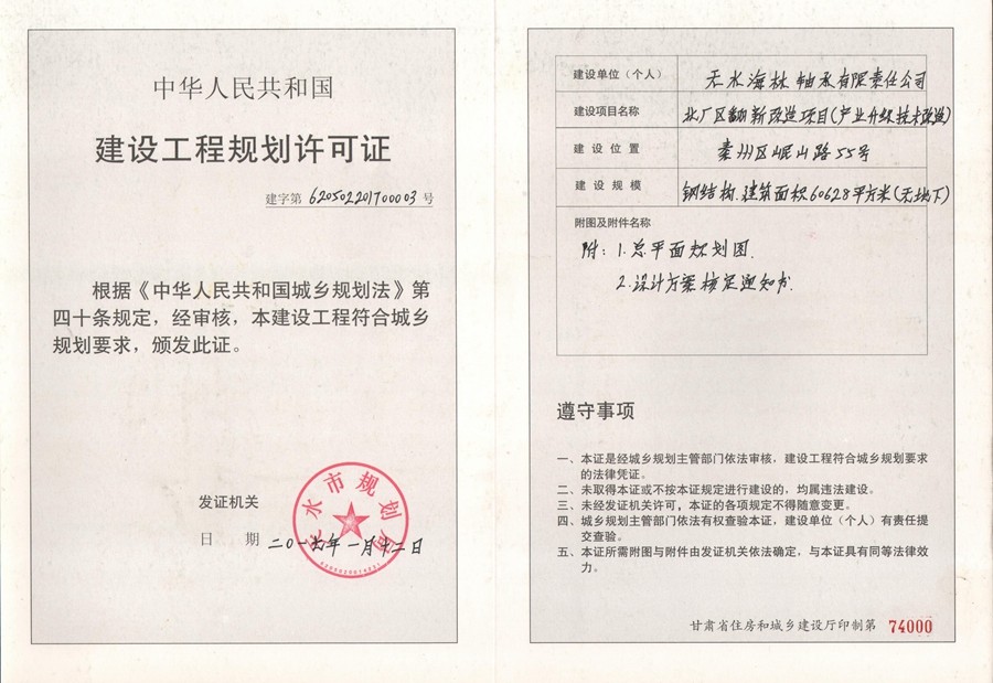 七、北厂区翻新改造项目(产业升级技术改造)许可证编号为建字第620502201700003号,建设地址为“秦州区岷山路55号”,建设规模为“钢结构,建筑面积60628平方米(无地下)”,建设单位为天水海林轴承有限责任公司,发证日期为2017年1月12日。