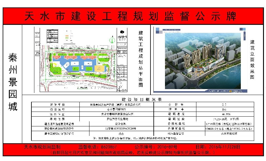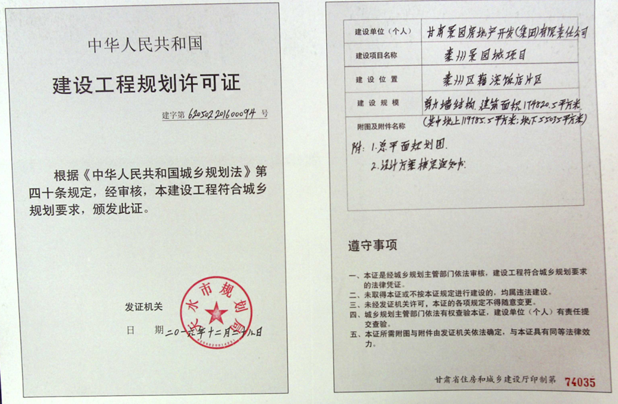 三、秦州景园城许可证编号为建字第620502201600094号,建设地址为“秦州区藉滨饭店片区”,建设规模为“剪力墙结构,建筑面积174820.5平方米(其中地上119785.5平方米,地下55035平方米)”,建设单位为甘肃景园房地产开发(集团)有限责任公司,发证日期为2016年12月28日。