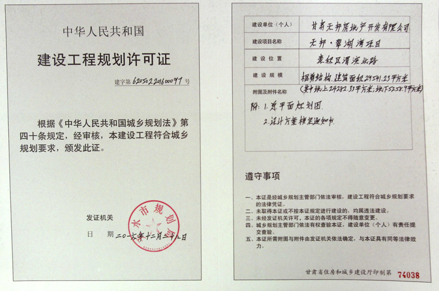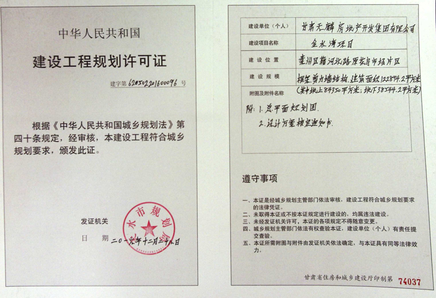 一、天麟金水湾许可证编号为建字第620502201600096号,建设地址为“秦州区藉河北路原花鸟市场片区”,建设规模为“框架剪力墙结构,建筑面积122894.2平方米(其中地上84350平方米,地下38544.2平方米)”,建设单位为甘肃天麟房地产开发集团有限公司,发证日期为2016年12月28日。