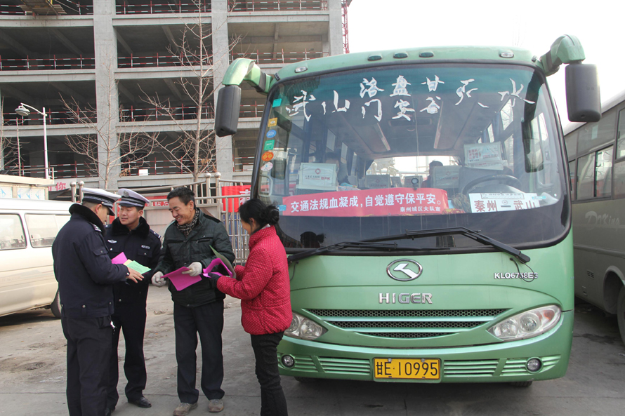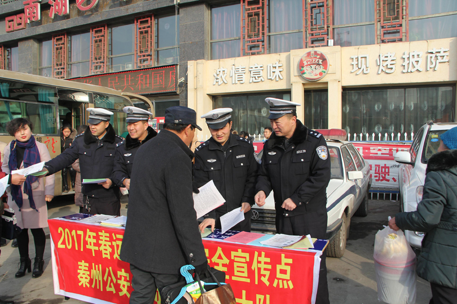 秦州公安分局郊区交警大队在南湖车站设立春运启动宣传点,,宣传民警把《致驾驶人的一封信》、《致交通参与者的一封信》、《春运交通安全提示》、《春运交通安全常识》等春运宣传单分别送给春运驾驶人、车主、售票员手中,登上春运客车,进行面对面的宣讲,增强了春运参与者的交通安全责任意识,提高了他们遵守交通安全法律法规的主动性、自觉性。