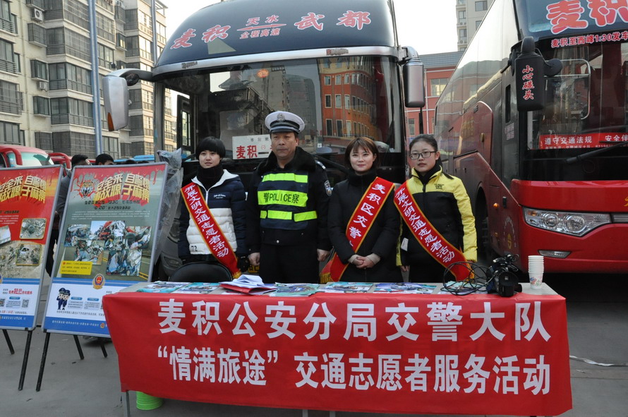 麦积公安分局交警大队在天嘉集团麦积汽车站组织动员辖区青年志愿者,开展“情满旅途”暖冬行动交通志愿者春运服务宣传活动。志愿者向群众提供引导咨询、秩序维护、重点帮扶、便民利民和应急救援五个方面的宣传服务,营造平安出行、温暖同行的良好交通出行环境。