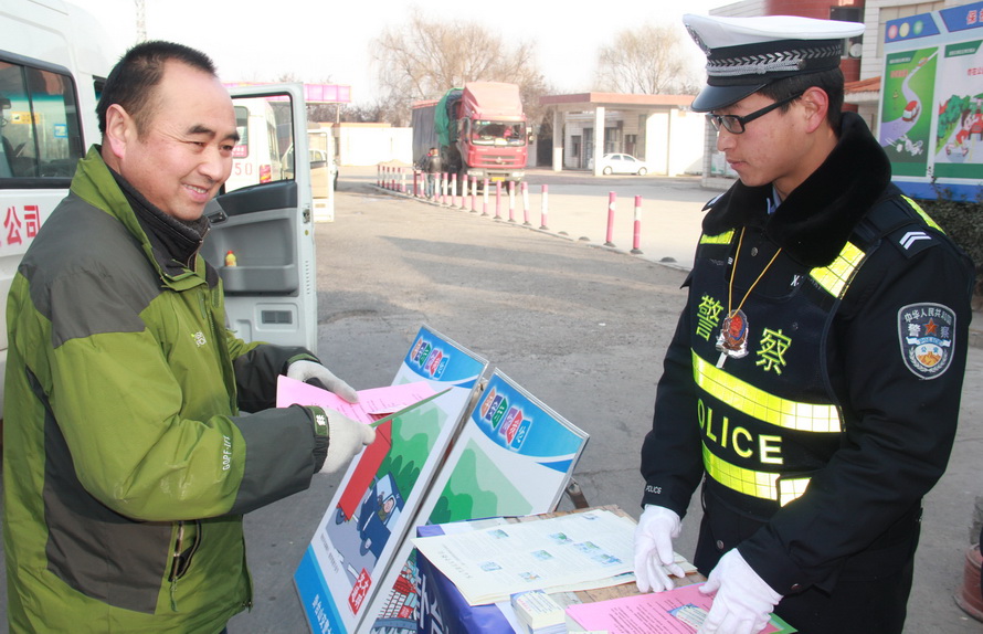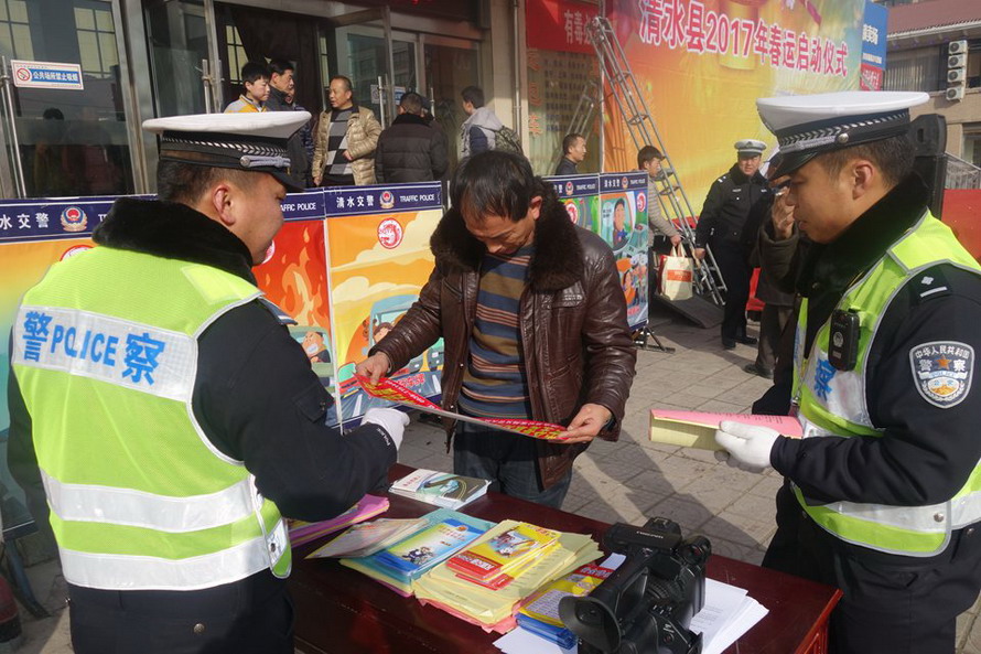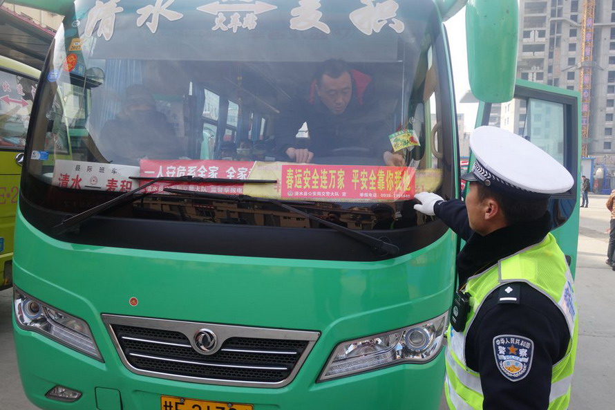 清水县公安局交警大队在顺达运输公司组织警力向广大驾驶人及乘客散发《致广大交通参与者的一份信》、赠送安全提示卡片和客运驾驶人安全知识读本等宣传资料,积极倡导平安春运理念。