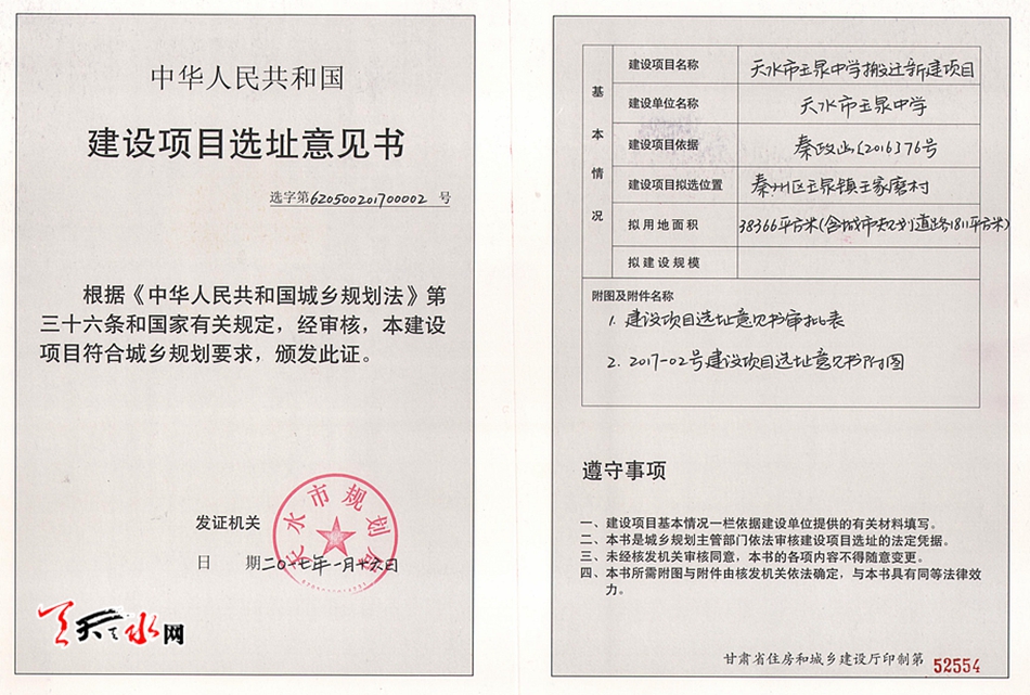 天天天水网讯 近日,天水市规划局公布天水市玉泉中学搬迁新建项目信息。公告显示,天水市玉泉中学新址位于秦州区玉泉镇王家磨村,拟用地面积38366平方米。
