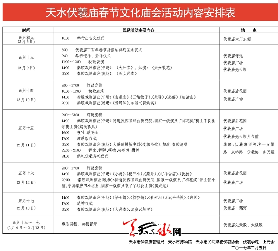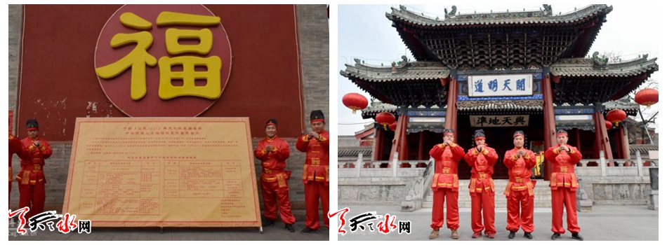 天天天水网讯【记者刘蕾】正月初九(公元2月5日)上午,吉祥中华—丁酉(2017)年天水伏羲庙春节庙会举行出告文仪式,将《天水伏羲庙春节文化庙会活动内容安排表》以传统告文的形式向市民公告。