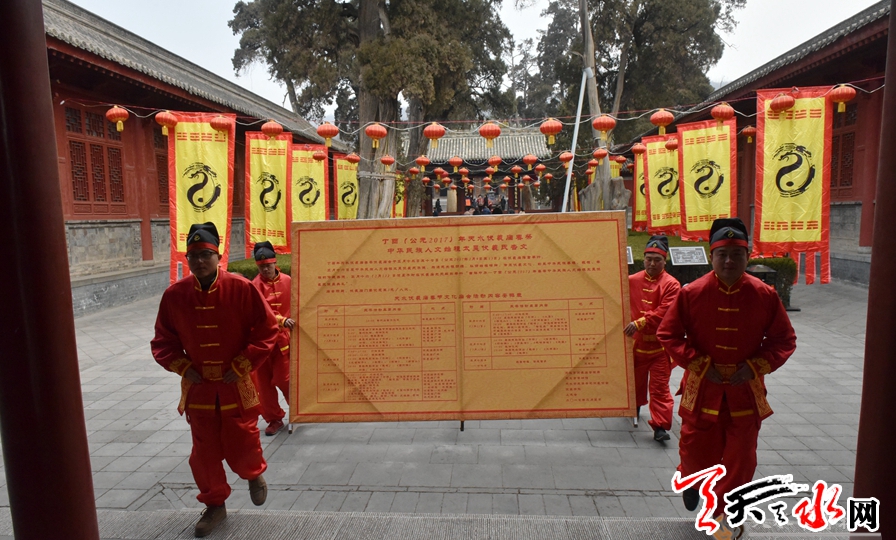 当天上午,身着新式礼仪服装的4名祭祀人员将公告牌从伏羲庙院内抬向祭祀伏羲广场戏楼东侧,标志着天水伏羲庙丁酉(2017)年天水伏羲庙春节庙会活动正式拉开帷幕。