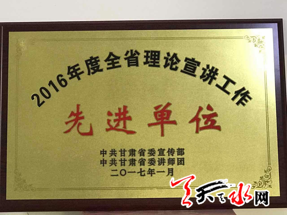 天天天水网讯【记者 张文都】2月7日,记者从有关部门获悉,天水市委讲师团、天水市清水县委宣传部获得“2016年度全省理论宣讲工作先进单位”荣誉称号。