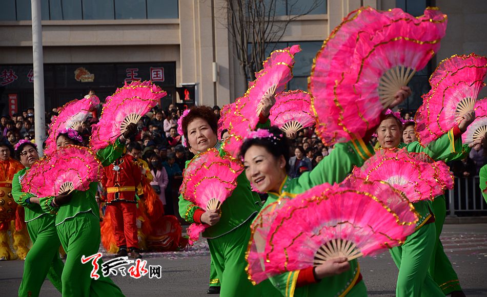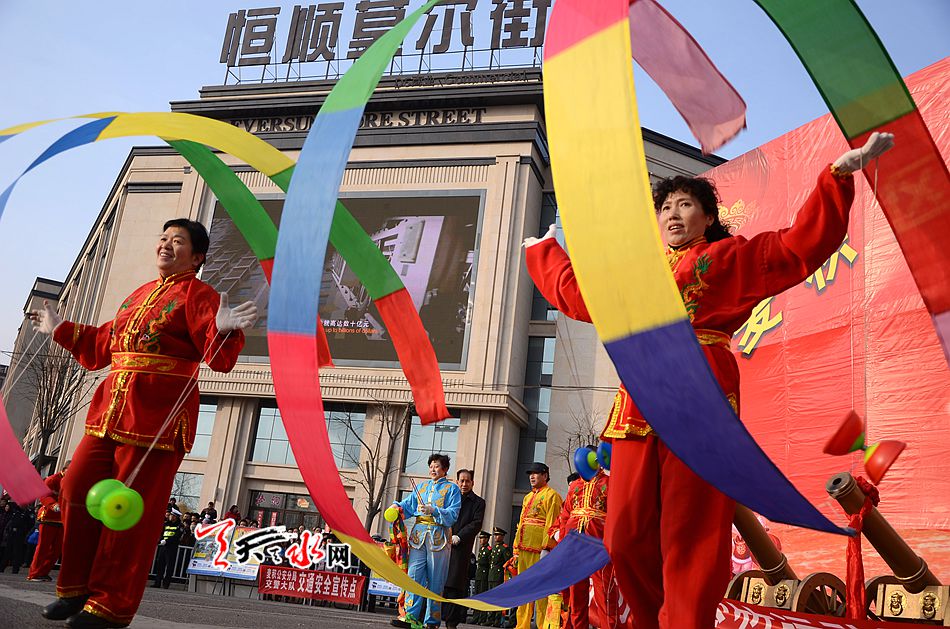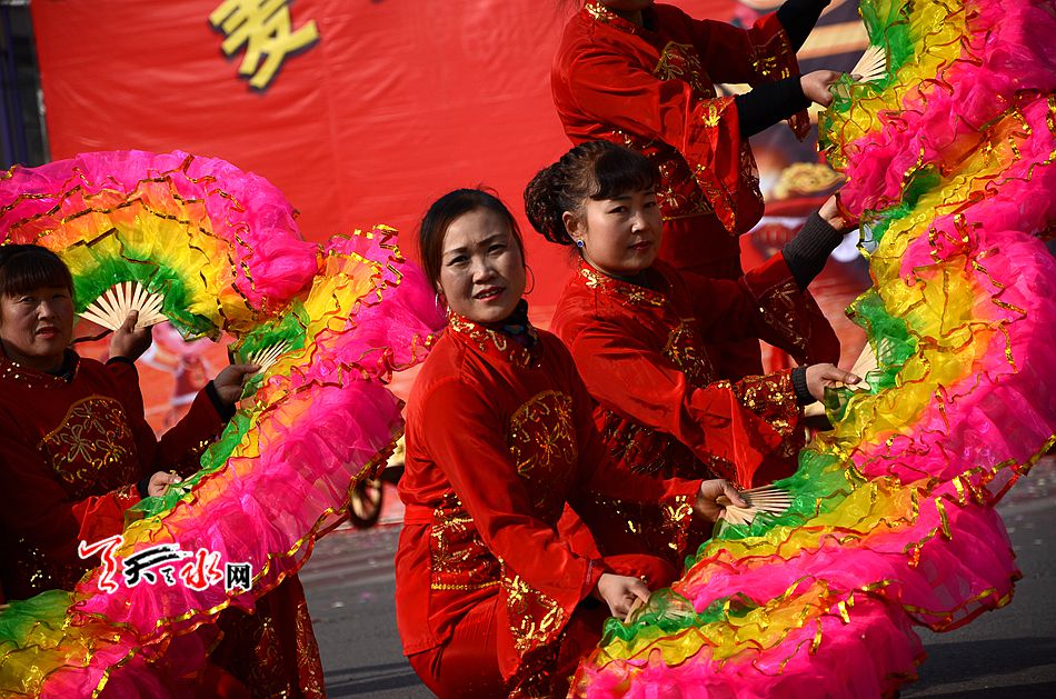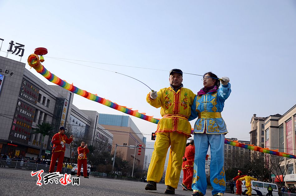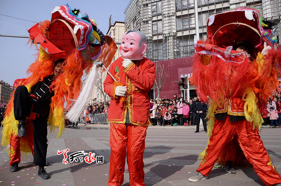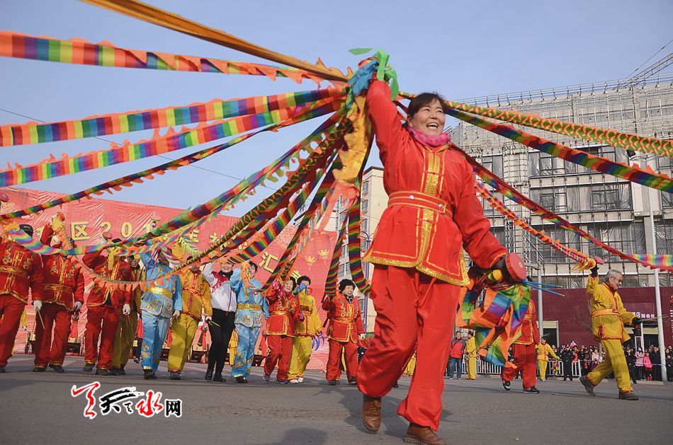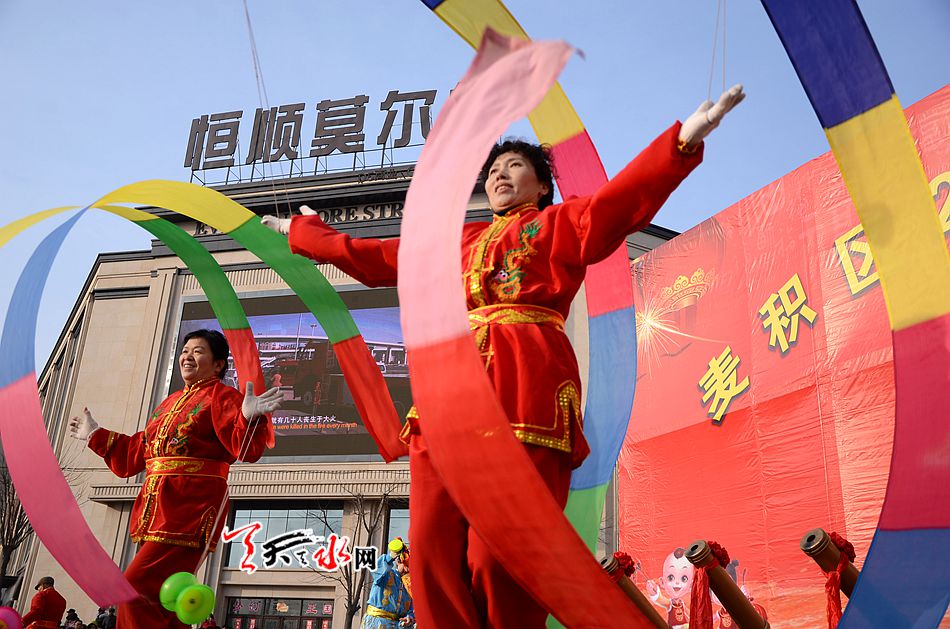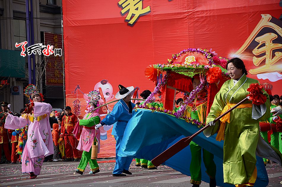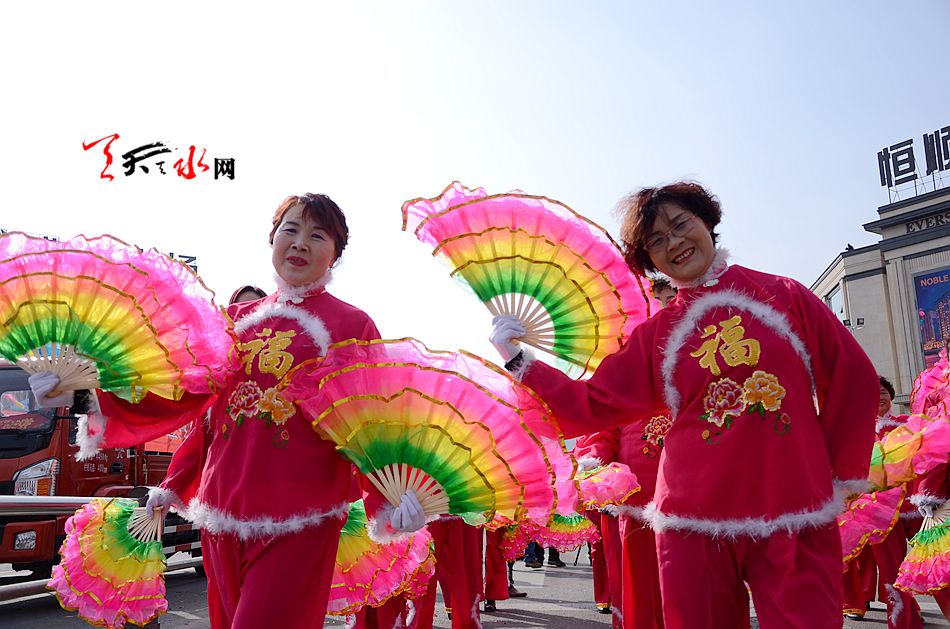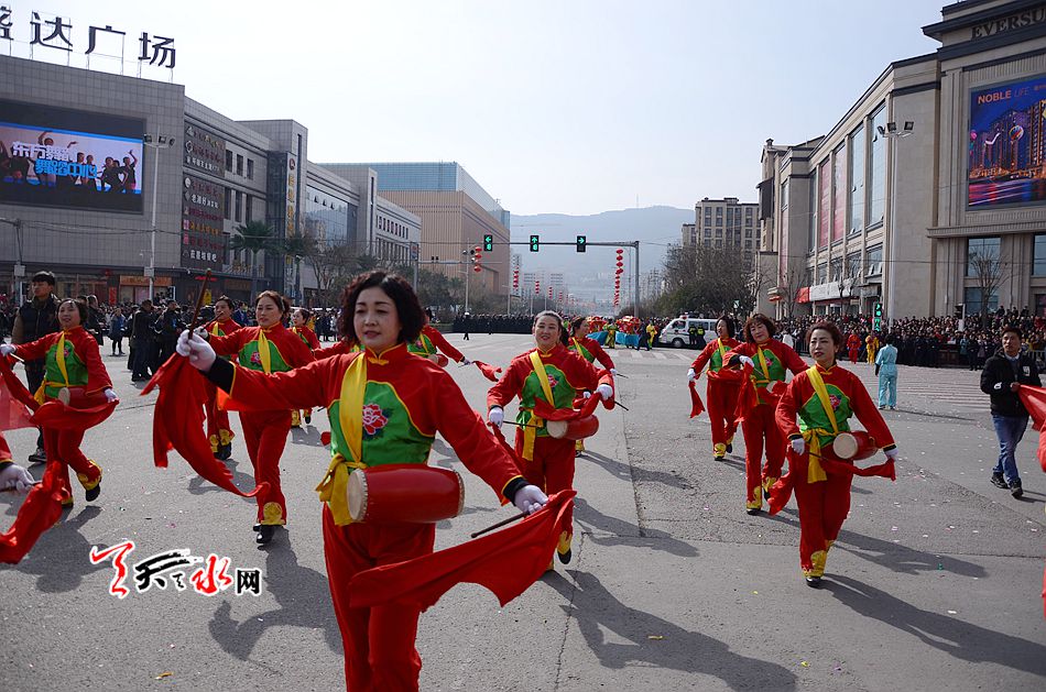 麦积区羲皇大道、天河南路、马跑泉大道这些社火汇演的行径路线上,彩旗飞舞,彩扇翻飞,像燃烧的火焰, 如翩然起舞的蜂蝶,绽放着新春的祥和瑞气。舞蹈、空竹、 跑旱船、秧歌、舞狮、扇子舞、高台等一系列社火汇演精彩纷呈,喧天锣鼓气势磅礴,空竹彩龙五彩流光,铿锵恢弘的激情歌声,灵动的“旱船”,威风凛凛的高台, 将节日装扮得花海四溢,热火朝天。