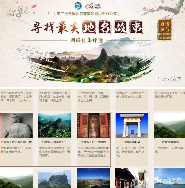 每一块国土都有名字,每一个名字都饱含乡愁。近日,第二次全国地名普查——“寻找最美地名故事”网络征集阶段圆满结束。这一由第二次全国地名普查领导小组办公室主办、光明网承办的网络征集评选活动,自2016年10月14日征集活动启动以来,各级地名普查办广泛动员、积极参与、踊跃投稿。截至2016年12月26日,共收到3600余份参选作品。我市“甘肃省天水市”、“甘肃省天水市麦积山”、“甘肃省天水市伏羲庙”、“甘肃省天水市大地湾”等四件作品入围。地名是文化的镜像。把家乡的传统地名文化传播出去,让我们的家乡,我们热爱熟悉的地名成为家喻户晓的名字!