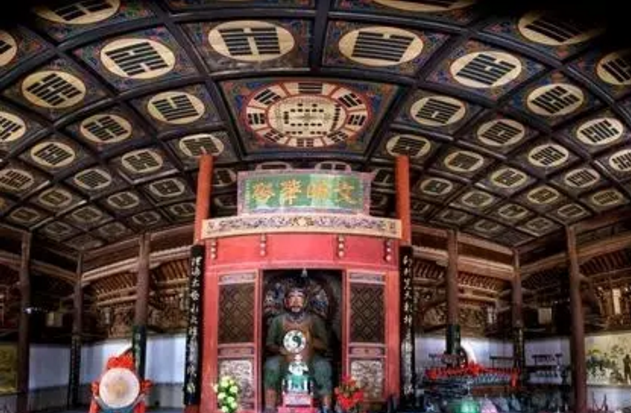 巍然屹立于砖筑月台之上的先天殿又叫正殿、大殿,是伏羲庙的主体建筑。这是我国采用早期“减柱法”建造大屋的成功案例,富含极大的创造性。大殿之内供奉着伏羲彩塑巨像一尊。身着树叶、端然而坐的人祖,体形魁梧,气宇轩昂,双手托着八卦太极图,目光如炬。大殿藻井顶棚的正中是太极河洛八卦图,四周等分为六十四格,格内彩绘六十四卦图。