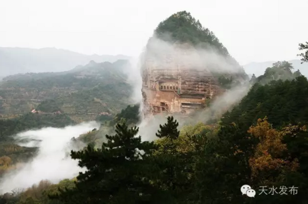麦积山周围风景秀丽,山峦上密布着翠柏苍松、野花茂草。攀上山顶,极目远望,四面全是郁郁葱葱的青山,只见千山万壑,重峦叠嶂,青松似海,云雾阵阵,远景近物交织在一起,构成了一幅美丽的图景,被称为天水八景之首的“麦积烟雨”。