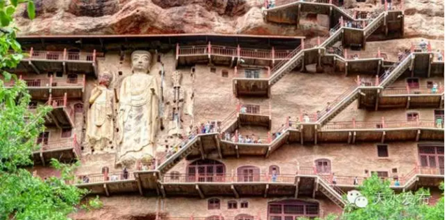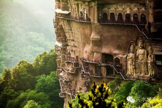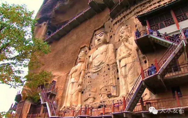 麦积山石窟创建于东晋十六国后秦时期,中经西秦、北魏、西魏、北周、隋、唐、五代、宋、元、明、清等十多个朝代的不断营造或重修,遂成为一个大型石窟群。期间曾出现了几次大的发展高潮,并多有能工巧匠和绘塑高手云集,共同创造了巧夺天工的佛教艺术。窟群开凿于悬崖峭壁上,多在20~80米高的壁面,星罗棋布,密如蜂房,错落有致,蔚为壮观;且有飞栈云梯回环往复,上下相联,惊奇险绝,世所罕见。窟群和栈道形成了一个宏伟壮观的立体建筑群。由于砂砾岩不宜雕刻,故造像多为泥塑或石胎泥塑;又因阴湿多雨,壁画大都脱落,而泥塑却基本完好。中部洞窟在唐开元二十二年(734)毁于地震,窟群遂分为东崖、西崖两部分。现存自东晋十六国后秦以来历代大小洞窟209个,泥塑及石雕1300余件,包括大小造像7800余身,壁画1000余平方米,为我国名的早期四大石窟之一。