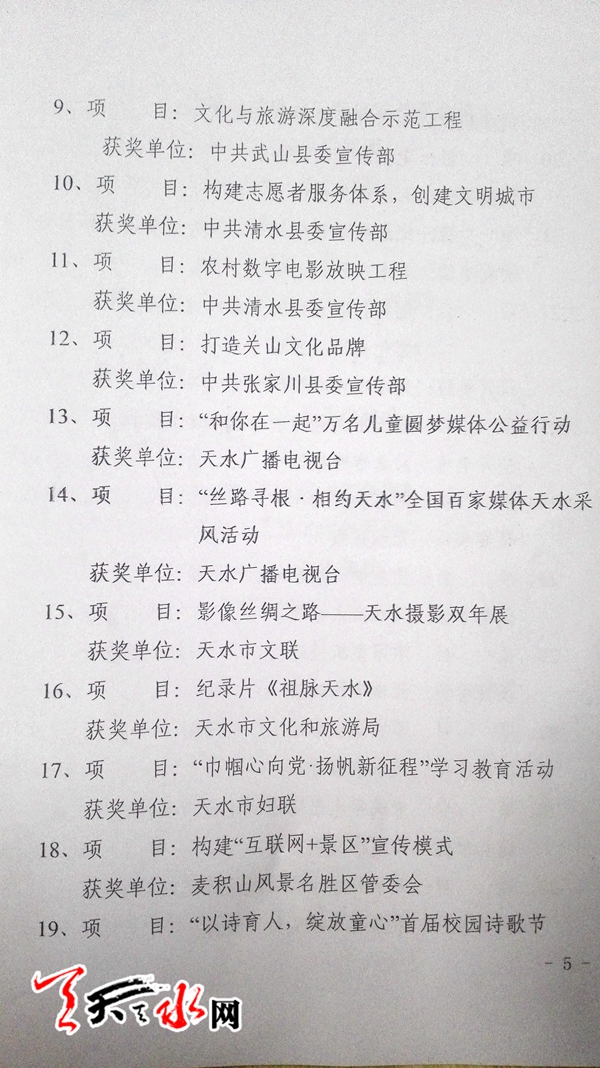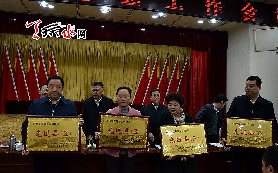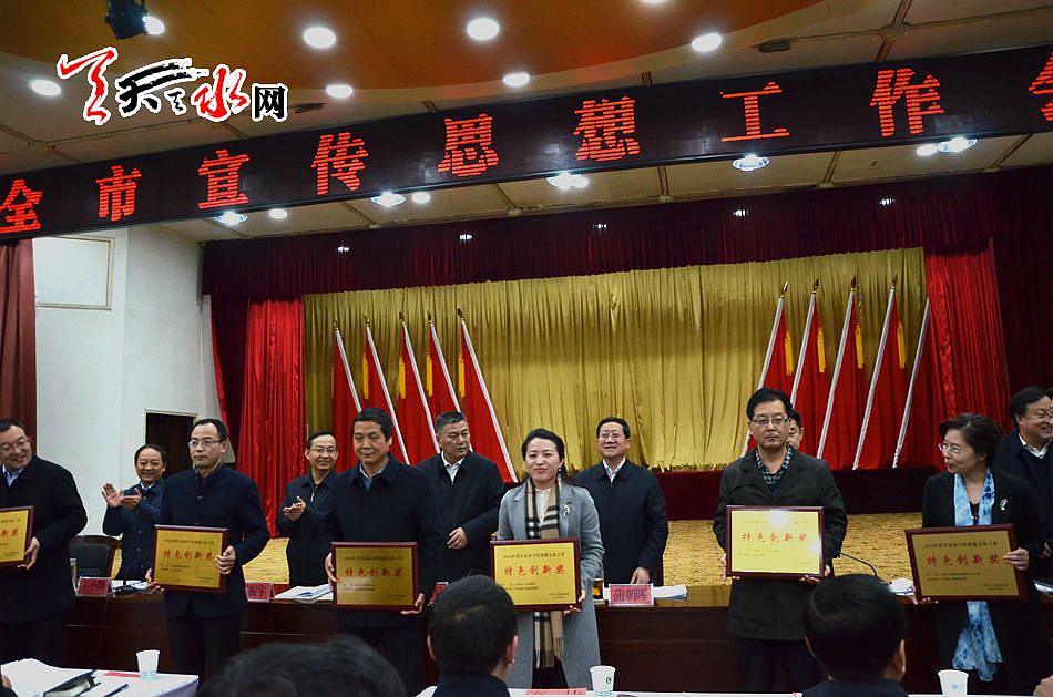 天天天水网讯 2月21日召开的全市宣传思想工作会议上,2016年度全市宣传思想工作先进县区及特色创新奖揭晓。秦州、清水和秦安三县区被评为2016年度宣传思想工作先进县区。天水66号文化创意园项目等36个项目获2016年度“全市宣传思想文化工作特色创新奖”,天水日报社报送的“中国天水.李杜诗歌节”,天天天水网报送的“|微电影拍摄工程”榜上有名。 图/张文都