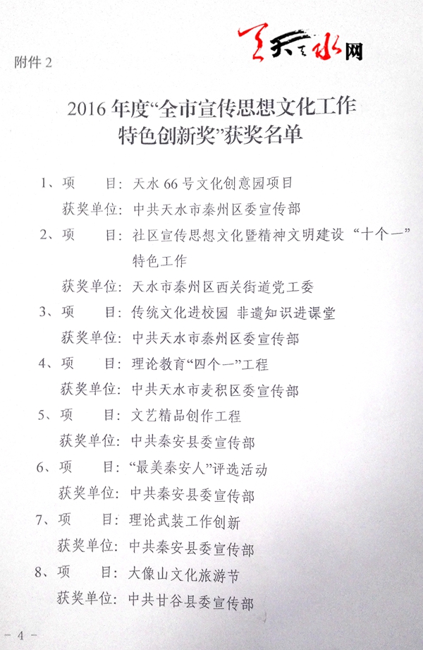 为表彰先进、树立典型,进一步激发全市宣传思想文化战线的创造活力,形成鼓励创新的良好氛围和激励机制,推动我市宣传思想文化工作出特色、出亮点、出经验,按照2016年度宣传思想文化工作目标责任考核结果,经市委宣传部研究,决定授予秦州区等三个县区“2016年度全市宣传思想工作先进县区”称号,授予“天水66号文化创意园项目”等36项工作为2016年度“全市宣传思想文化工作特色创新奖”。