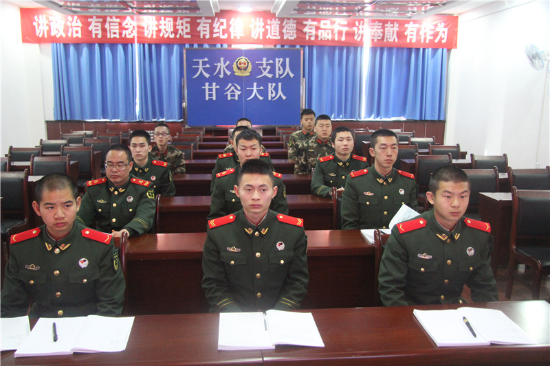 天天天水网讯 【通讯员王形 朱万】为进一步发扬我军尊干爱兵、官兵一致的优良传统,密切官兵关系,增进官兵之间友谊,积极构建和谐警营环境。2月24日,甘谷中队组织官兵开展了以“尊干爱兵”为内容的教育授课活动。