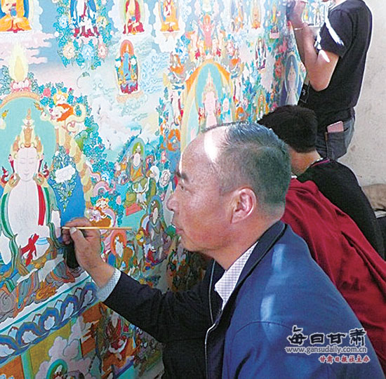 2.交巴加布,男,49岁,甘南藏族唐卡省级传承人。他先后师承父亲九麦(甘南藏族唐卡国家级传承人,甘肃省工艺美术大师)和拉卜楞寺著名画师齐智合。他在唐卡着色、晕染、勾线、上色方面都有极深的造诣,画风细腻,人物形象栩栩如生。2010年8月,他的作品《十八罗汉渡水图》获第三届青海国际唐卡艺术与文化遗产暨热贡唐卡(世界非物质文化遗产)博览会组委会颁发的三等奖;2015年9月,红卡带彩文殊菩萨三尊佛在第五届中国成都国际非物质文化遗产节评展中获一等奖;2015年10月,唐卡药师佛极乐世界在第七届(浙江)非物质文化遗产博览会评展中获金奖。2014年,他荣获“甘肃省唐卡工艺美术师”称号。