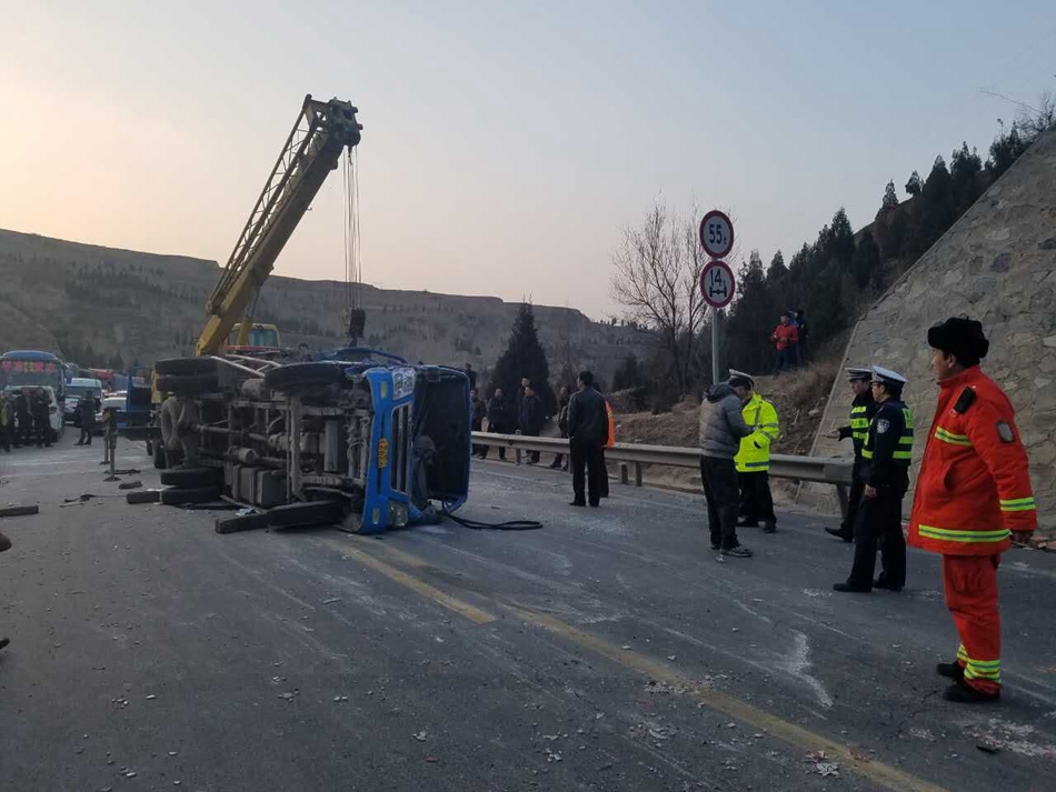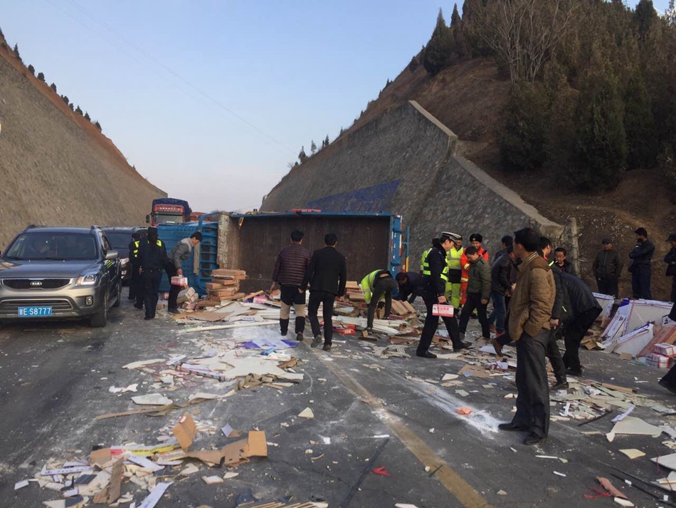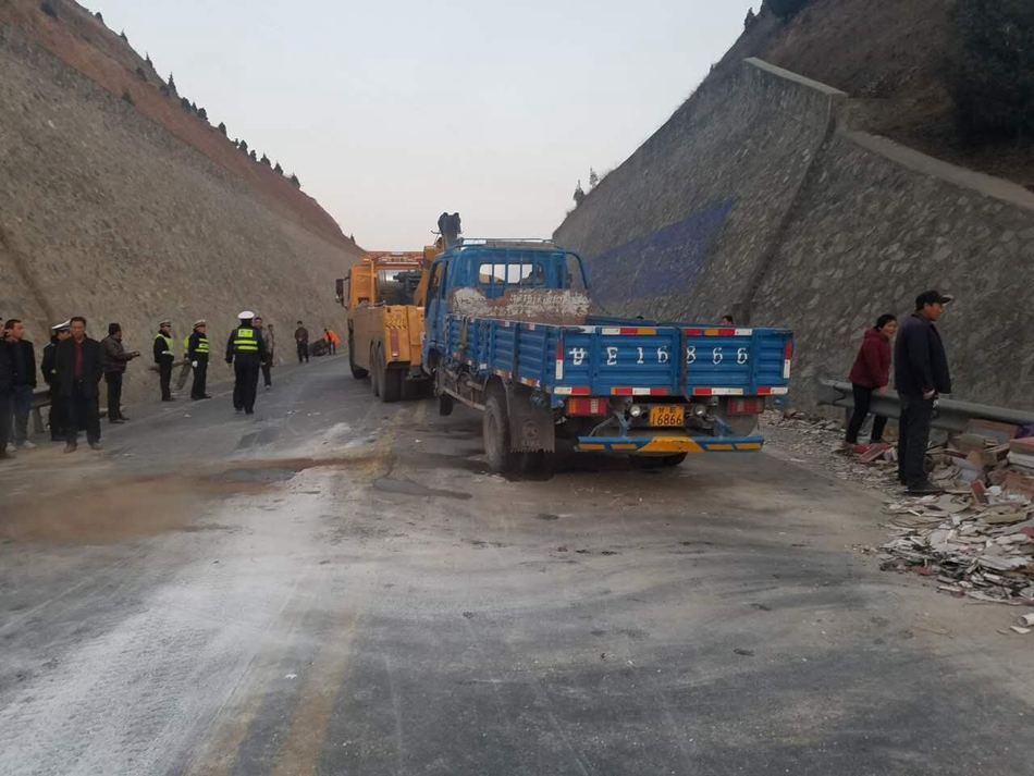 天天天水网讯【记者张超】2月27日下午17时,天巉公路天水向兰州方向青宁村附近发生一起车祸,一辆载 满瓷砖的小货车在下坡时遇到急弯路段,而对面正好驶来一辆大货车,小货车驾驶员紧急躲闪,但仍擦 到大货车的侧面,导致小货车侧翻,瓷砖和建筑材料洒落一地,天巉公路也临时封闭。