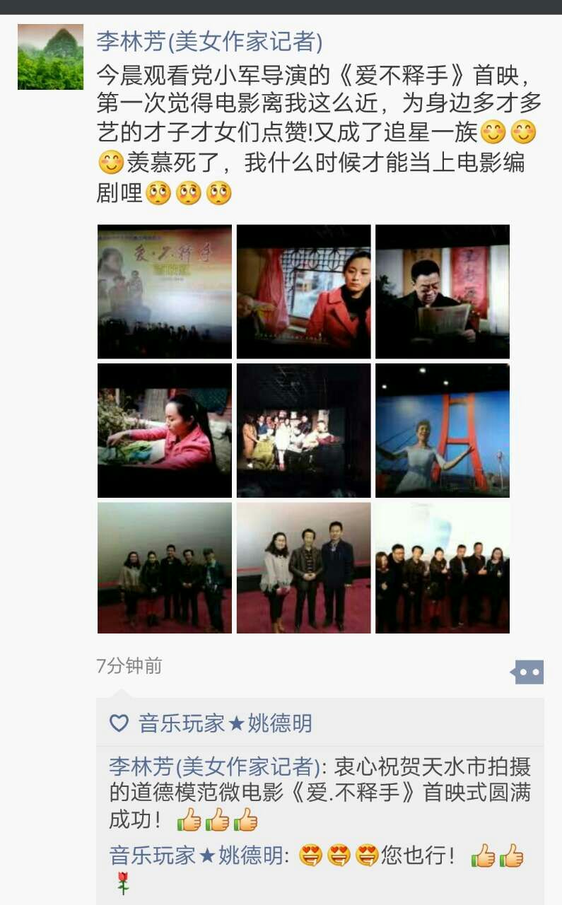 《爱·不释手》在各大网站发布后,网友纷纷留言祝贺天水首部道德模范首映,同时微信朋友圈里, 《爱·不释手》首映也成了一个热门话题,作家李林芳留言说“今晨观看《爱·不释手》首映,第一次觉得电影离我这么近,为身边多才多艺的才子才女们点赞!又成了追星一族,羡慕死了,什么时候我才能当上电影编剧呢。”