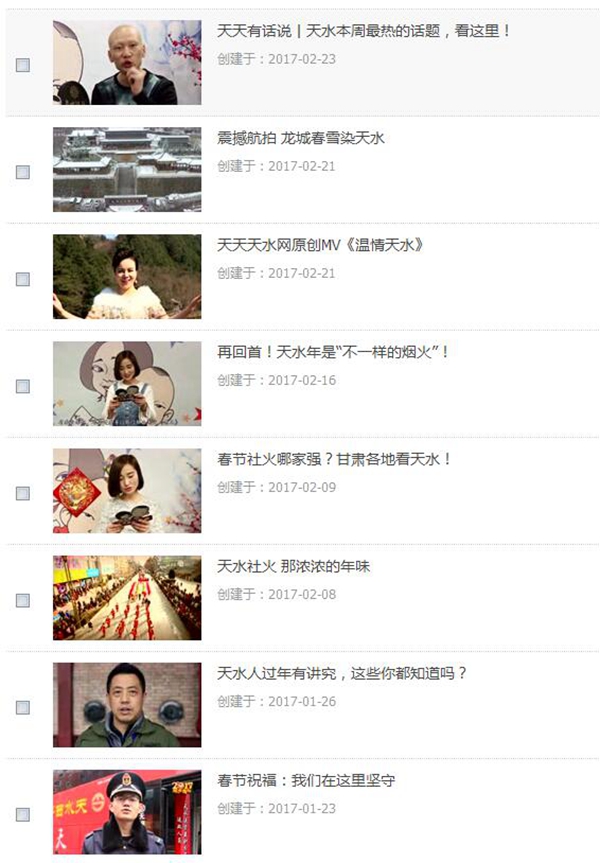 2016年,天天天水网“微”团队共拍摄微电影微视频27部,制作720VR全景图11幅,全是以传播正能量为出发点和落脚点,通过读者喜闻乐见的表述方式,在编辑过程中巧妙引入时尚潮流元素,并结合群众关心的话题,力图让受众在潜移默化中受到精神的洗礼。