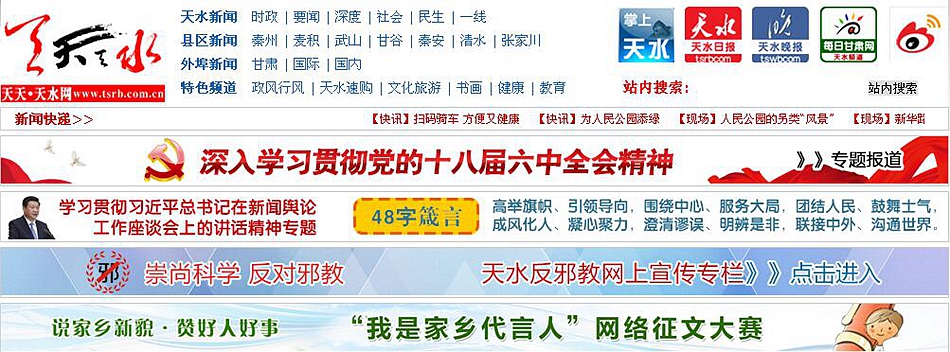 天天天水网是天水日报社党报新媒体,党报姓党的属性,注定天天天水网“微”团队在“三微一端+vr”建设过程中,不能一味迎合部分网友的低级趣味,而是要主动承担起在新媒体新平台传递正能量、宣传天水,讲好天水故事的重大责任,从而在“微平台”上开辟弘扬社会主旋律、传播主流价值观的舆论阵地。
