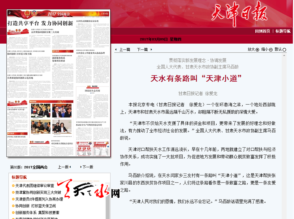 “天津市不仅给天水支援了具体的资金和项目,更带来了发展的好理念和好做法,有力推动了全市经济社会的发展。”全国人大代表、甘肃天水市政协副主席马百龄说。