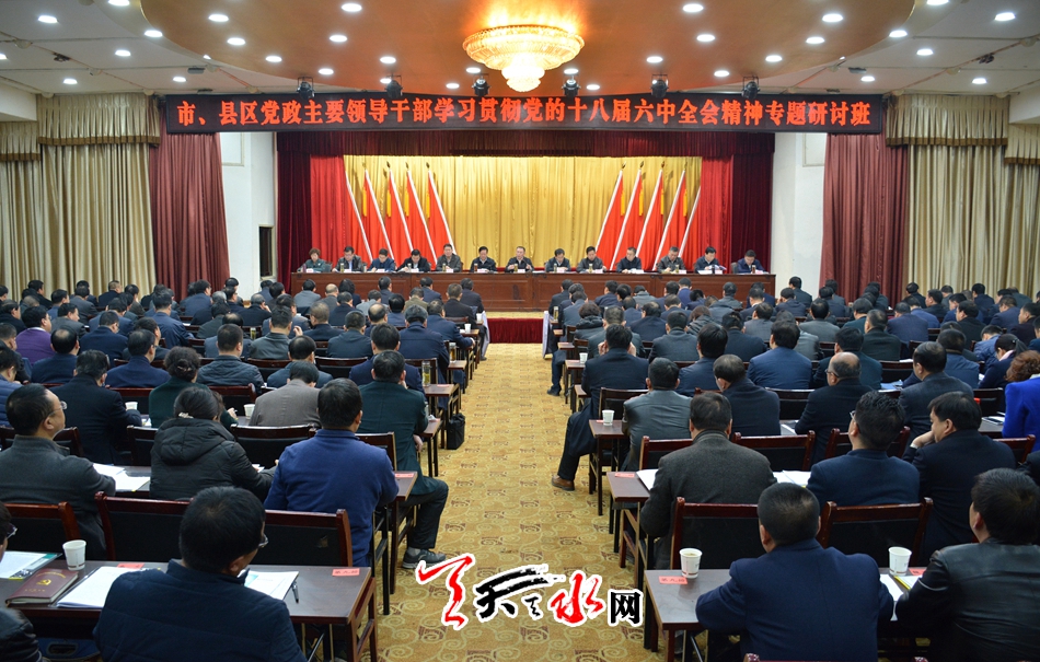 天天天水网讯【记者郝勤学 王晓馨】3月10日,市、县区党政主要领导干部学习贯彻党的十八届六中全会精神专题研讨班在天水迎宾馆举行。研讨班主要围绕深入贯彻中央、省委十八届六中全会专题研讨班特别是习近平总书记重要讲话、视察甘肃时提出的“八个着力”重要指示精神,对持续抓好六中全会精神学习贯彻工作再作部署要求,教育引导全市各级各部门进一步树牢“四个意识”、提高政治站位、强化责任担当,推动全面从严治党不断向纵深发展,努力营造风清气正的政治生态,为建设幸福美好新天水提供坚强政治保证。