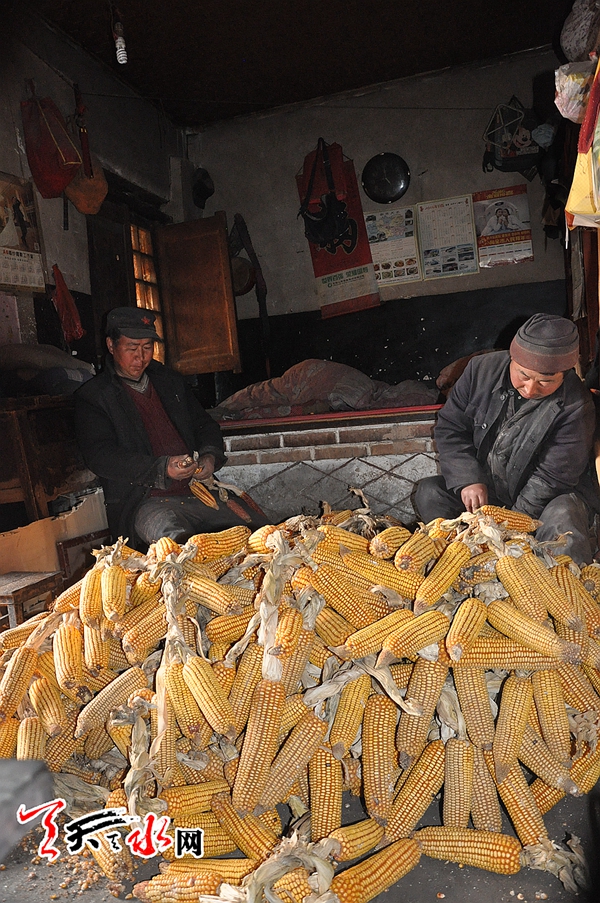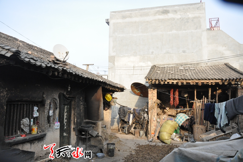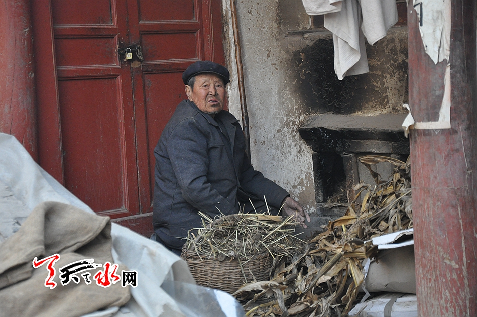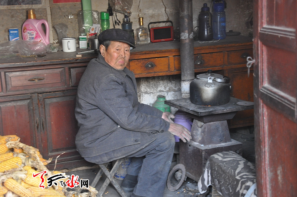 一个春阳温暖的下午,在爆料人的带领下记者来到天水市秦州区太京镇银坑村,顺着曲里拐弯的村间巷道,找到王坝娃的家,一条不足百米的巷道里,一座低矮的小院被包围在新建的各式小楼之中,踏进院门,一头瘦骨嶙峋的毛驴站在墙根晒太阳,不大的院子里零乱地堆放着驴粪和柴火,西主房的屋檐下,73岁的王坝娃跪在一堆柴火中烧炕,一双苍老的双手沾满灰渍,长期服药略显的浮肿脸上显得很平静。见有人进院,他扶着墙缓缓的站起,拍拍手上的灰土,挪动着脚步,一边嘴里咕啷着,一边挥手招呼我们进屋。黑乎乎的主屋里正当中堆放着一大堆玉米,两个中年男子坐在边上机械地挼着玉米。
