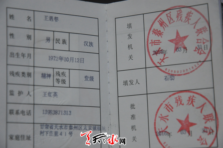 时光飞逝,转眼间王遇春到了谈婚论嫁的年龄,家里倾其所有给他娶了媳妇,看着贫困的家境,王遇春告别父母妻子外出务工,到北京做起了酒店保安,虽然他在为家拼命工作,但是妻子还是因为贫穷弃家而去,这个消息让王遇春遭遇了人生中的第一个晴天霹雳。福不双降,祸不单行在王遇春身上得到了完全的验证,王遇春还没有在走出妻子出走的阴影,又一个不幸降临到他的头上,在一次值班的过程中遇到一群醉酒之人在酒店滋事,他和同事在劝解的过程中被打成重伤,被一伙人护送回老家,经历这些打击,身体伤愈后的王遇春精神出现了分裂,神智时好时坏,神智好时还可以在父亲的敦促下干点农活,发病时就连父母也不敢让他出门,害怕他出去伤害村里人。在天水市残疾人联合会颁发给王遇春的相关证件上鉴定为一级精神残疾。