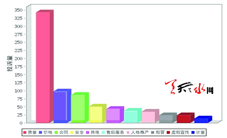 根据投诉性质分析(图一),2016年全年全市各级消协组织收到的投诉中,质量问题343件,占投诉总量的45.25%;价格问题98件,占12.93%;合同纠纷87件,占11.48%;安全问题51件,占6.73%;其他性质投诉44件,占5.80%;售后服务38件,占5.01%;涉及人格尊严投诉35件,占4.62%;涉及假冒商品投诉24件,占3.17%;涉及虚假宣传投诉24件,占3.17%;涉及计量问题14件,占1.85%。综合数据来看,质量、价格、合同、安全、其他占据了消费者投诉的前5名,其中,质量问题投诉占比近半。(见图一)