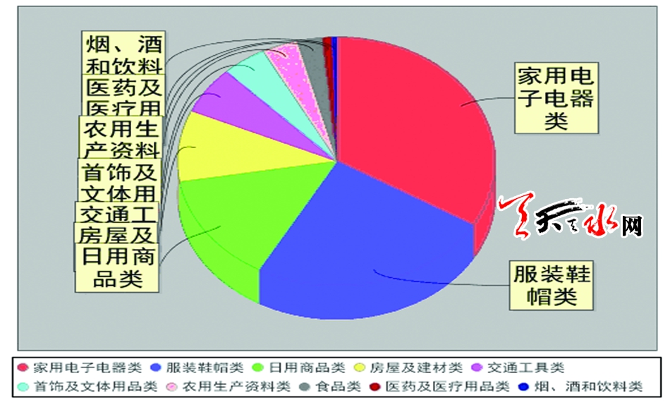 根据投诉商品种类分析(图二),家用电子电器类210件,占27.70%;服装鞋帽类154件,占20.32%;日用商品类89件,占11.74%;房屋及建材类58件,占7.65%;交通工具类39件,占5.15%;首饰及文体用品类28件,占3.69%;农用生产资料类23件,占3.03%;食品类16件,占2.11%;医药及医疗用品类6件,占0.79%;烟、酒和饮料类3件,占0.40%.其中,家用电子电器类、服装鞋帽类、日用商品类、房屋及建材类、交通工具类占据了消费者投诉的前5名。