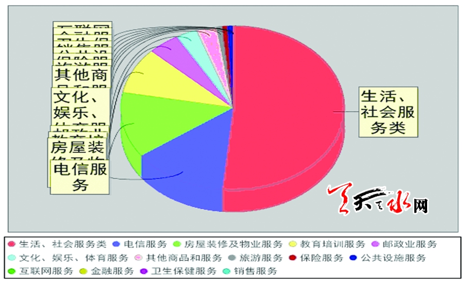 根据投诉服务分析(图三),生活、社会服务类68件,占8.97%;电信服务18件,占2.37%;房屋装修及物业服务17件,占2.24%;教育培训服务12件,占1.58%;邮政业服务6件,占0.79%;文化、娱乐、体育服务4件,占0.53%;其他商品和服务4件,占0.53%;旅游服务1件,占0.13%;保险服务1件,占0.13%;公共设施服务1件,占0.13%;其中,生活、社会服务类、电信服务、房屋装修及物业服务、教育培训服务、邮政业服务占据了消费者投诉的前5名。