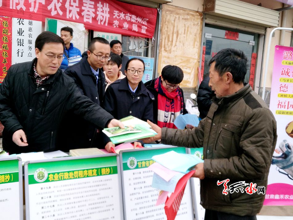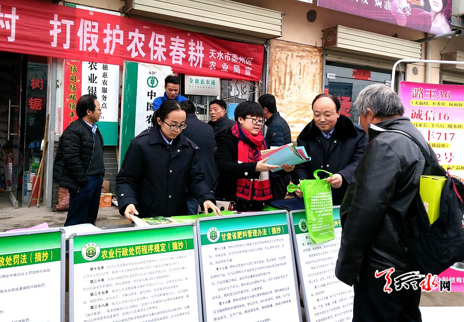 天天天水网讯【记者 张文都 通讯员 韩梅】3月15日,天水市农业局执法人员深入秦州区太京等乡镇农资销售门督查农资打假宣传活动,秦州区种子管理站以“3·15消费者权益日”为契机,围绕“放心农资进乡村,打假护农保春耕”的主题,利用农贸市场逢集日,与农业综合执法大队、土肥、植保等单位积极开展农资打假联合宣传活动。
