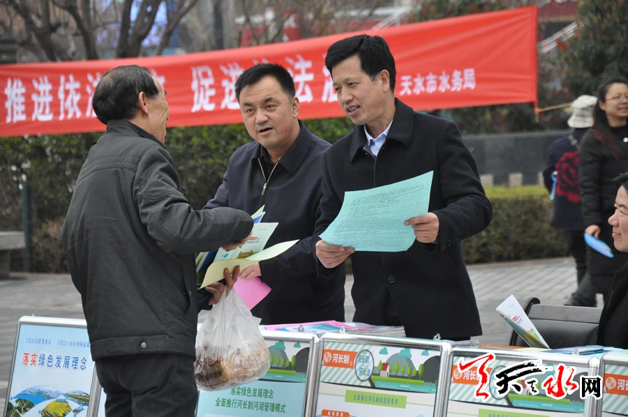 为进一步加强天水市水利宣传力度,营造良好的水利发展环境,全面贯彻落实全省水利局长会议安排部署,以保护水资源、防治水污染、改善水环境、修复水生态、加强水政执法为主要任务,落实绿色发展理念、全面推行河长制,持续深化水生态文明建设,依法行政、依法治水,进一步营造珍惜水资源的法治环境,为“维护河湖健康生命”奠定坚实基础。天水市在“世界水日” “中国水周”期间举行了《中华人民共和国水法》宣传活动。天水市水务部门主要宣传了《中华人民共和国水法》、《中华人民共和国防洪法》、《中华人民共和国水土保持法》等水法律法规,天水市市情水情、水利改革发展成效、水利法治建设成果以及我国河长制产生的时代背景、主要内涵以及推行河长制的重大现实意义与深远历史影响。